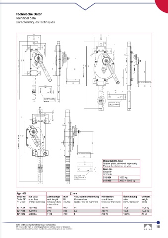 Best.-Nr. zul. Last Zahnstange Hub Hub / Kurbelumdrehung Kurbelkraft Übersetzung Gewicht